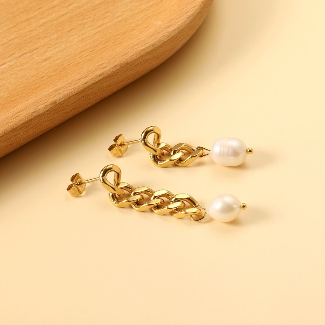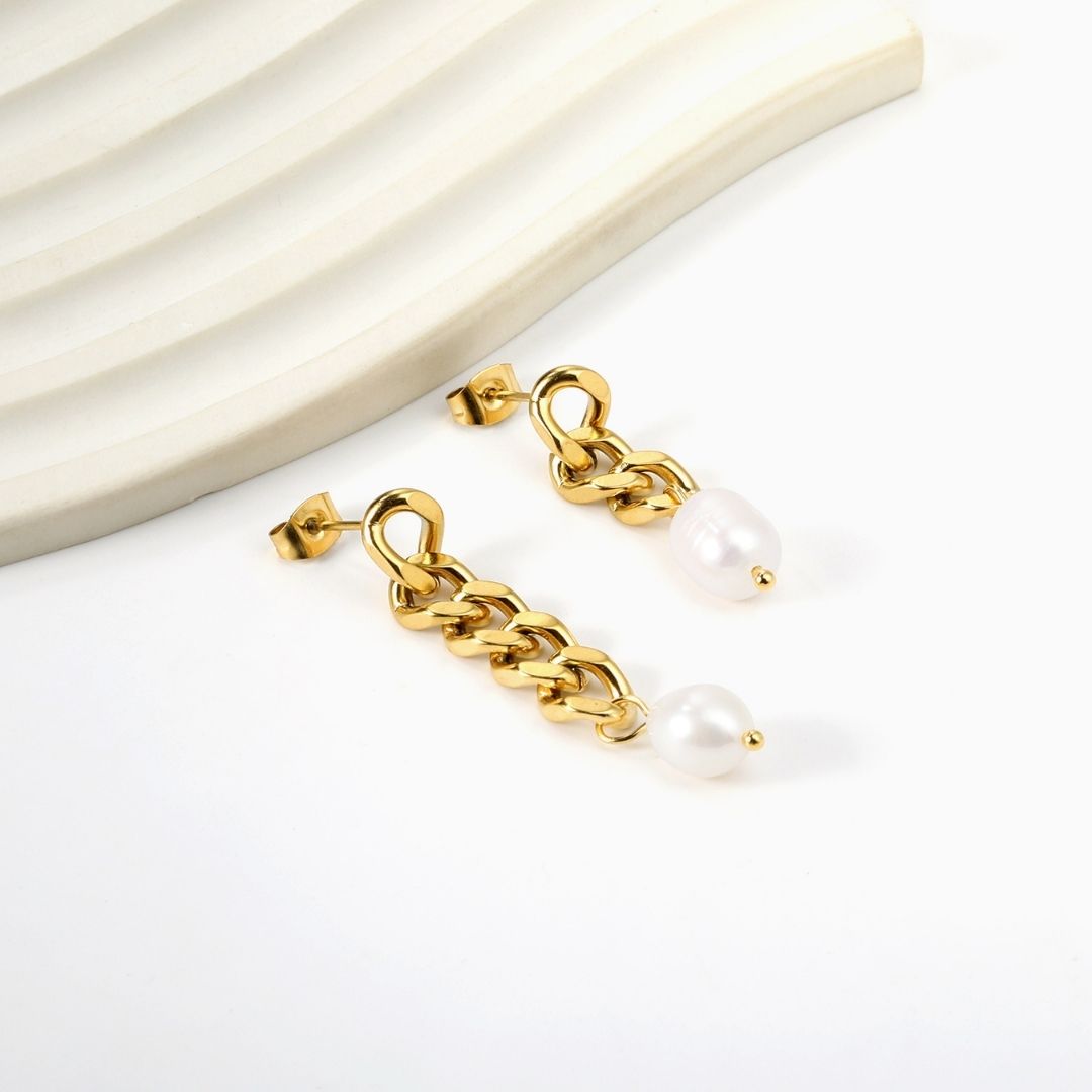 Add instant elegance with these gold stainless steel mismatched chain earrings, finished with luminous pearl-like drops. The bold chain links bring edge, while the pearls keep it timeless—perfect for elevating casual or dressy looks. Non-tarnish and hypoallergenic for all-day comfort.