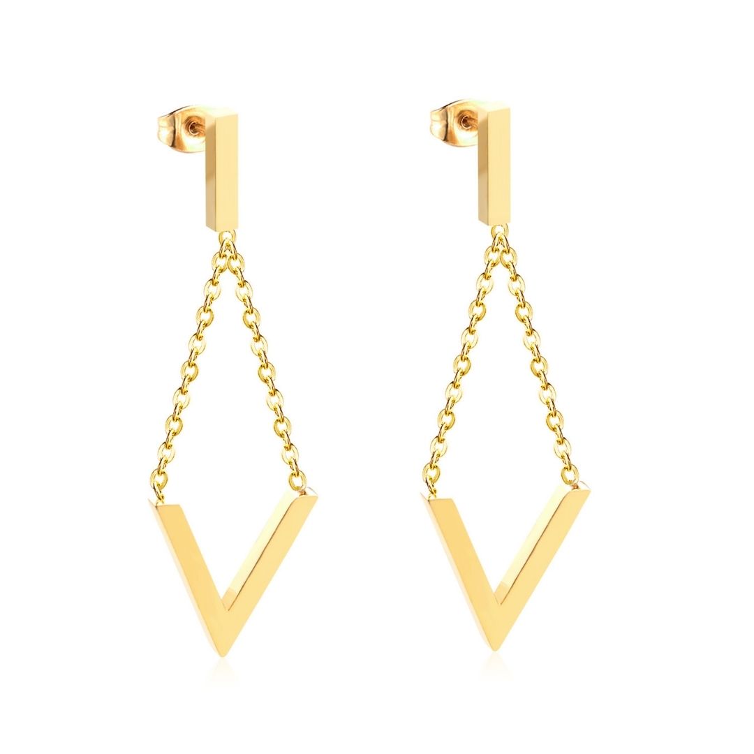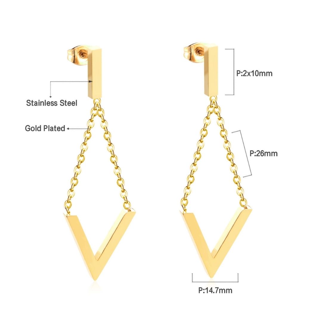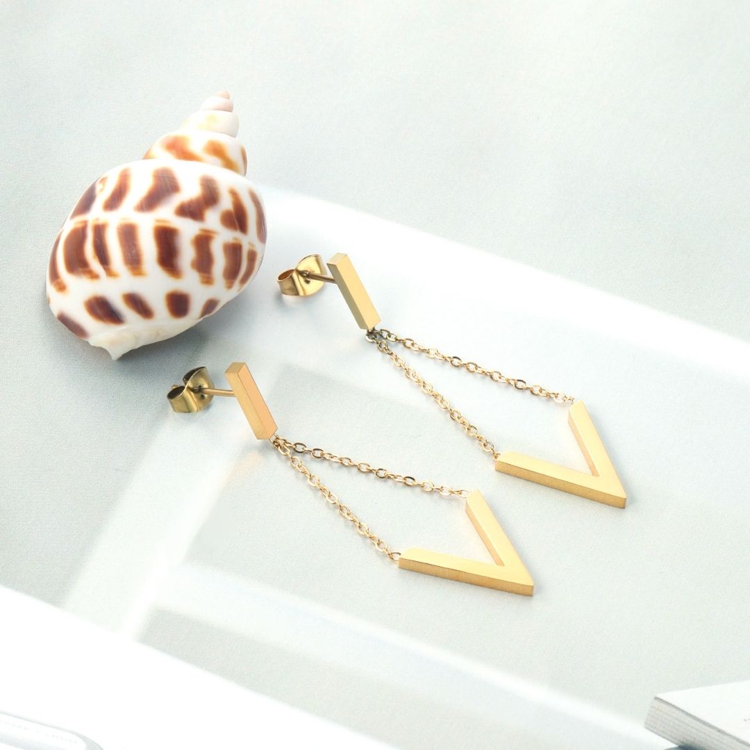Make a geometric statement with these gold stainless steel V-shaped earrings suspended from delicate chains. Lightweight yet eye-catching, they’re perfect for adding a chic edge to simple outfits. Non-tarnish and hypoallergenic for effortless style.