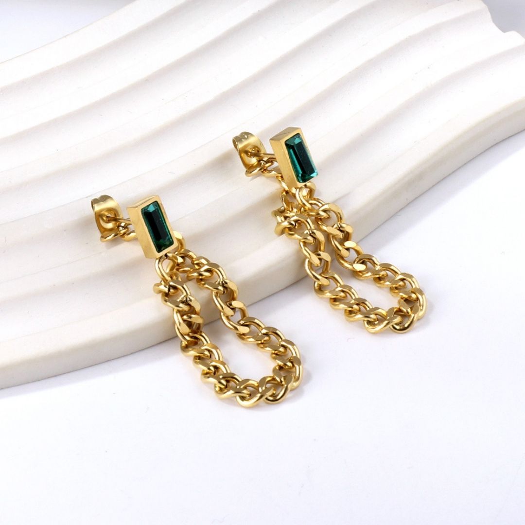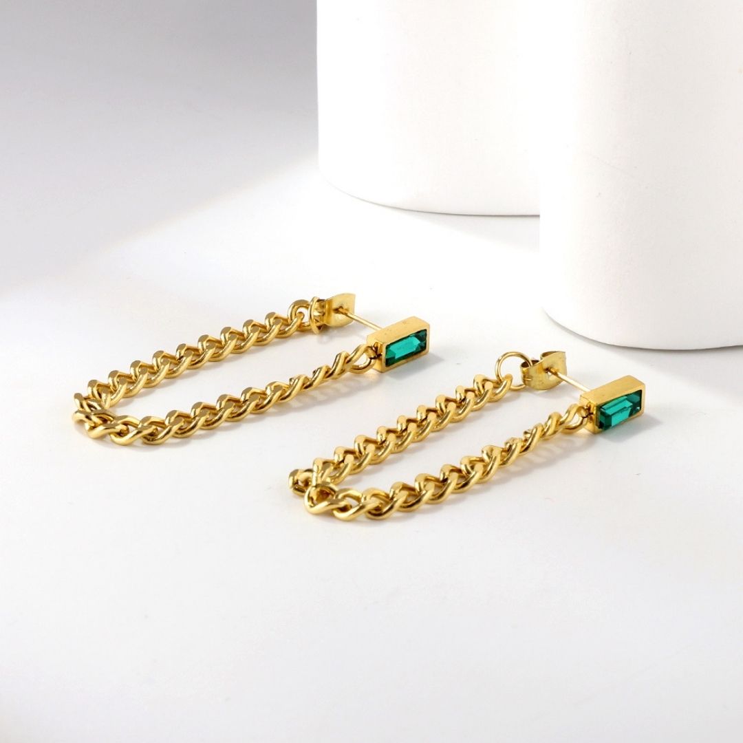 Turn heads with these gold stainless steel chain earrings topped with a striking gem-like emerald-green stone. The pop of color and chain detail make them the perfect statement for both casual and formal wear. Non-tarnish and hypoallergenic.