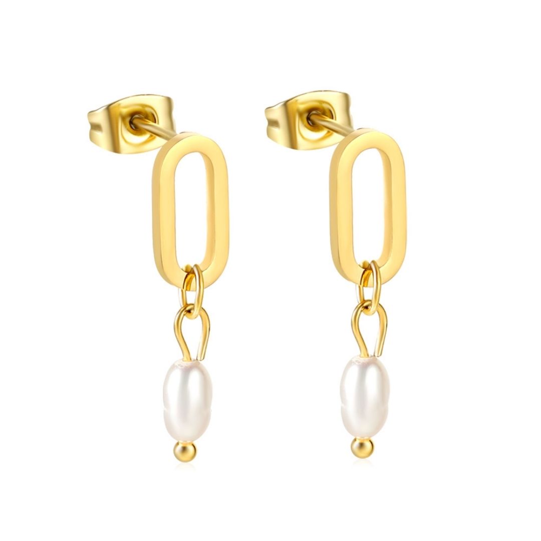 Sleek and sophisticated, these gold stainless steel oval-link earrings feature luminous pearl-like drops for a modern twist on a classic look. Perfect for pairing with both casual and elegant outfits. Non-tarnish and hypoallergenic for worry-free wear.